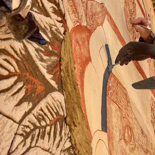 Sgraffito is an artistic technique in which multiple layers of contrasting coloured plaster are applied and then carefully carved to reveal textured, multidimensional surfaces beneath. Historically used on plastered walls and other surfaces, it has long served as a powerful technique for mural and architectural expression.