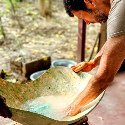 Oscar belongs to the third generation of stucco masters. He learned the trade from his father in the workshop and on site, developing with him a multitude of new and restoration jobs, especially in the north of Spain.He has worked in hotels, theatres, institutional buildings, commercial premises and private homes. Using techniques such as scagliola, lime stucco, plaster stucco, stone restoration etc. He has a deep understanding of traditional materials and techniques, which allows him to also experiment with new textures and colours. After the retirement of his teacher, he began a new stage in which he combines his need for experimentation and exploration with different natural and traditional materials in the search for new application techniques. With the continuity of work on site, undergoing a transmutation towards a more contemporary vision of the finishes. He has also begun a creative phase researching in the fields of art and sculpture using the experience in different techniques and materials acquired over the years. Oscar participates in both collective and solo art exhibitions in different European cities and countries.